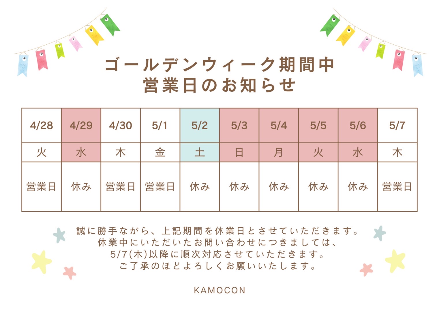 なお、休業中にご連絡がある場合は、
