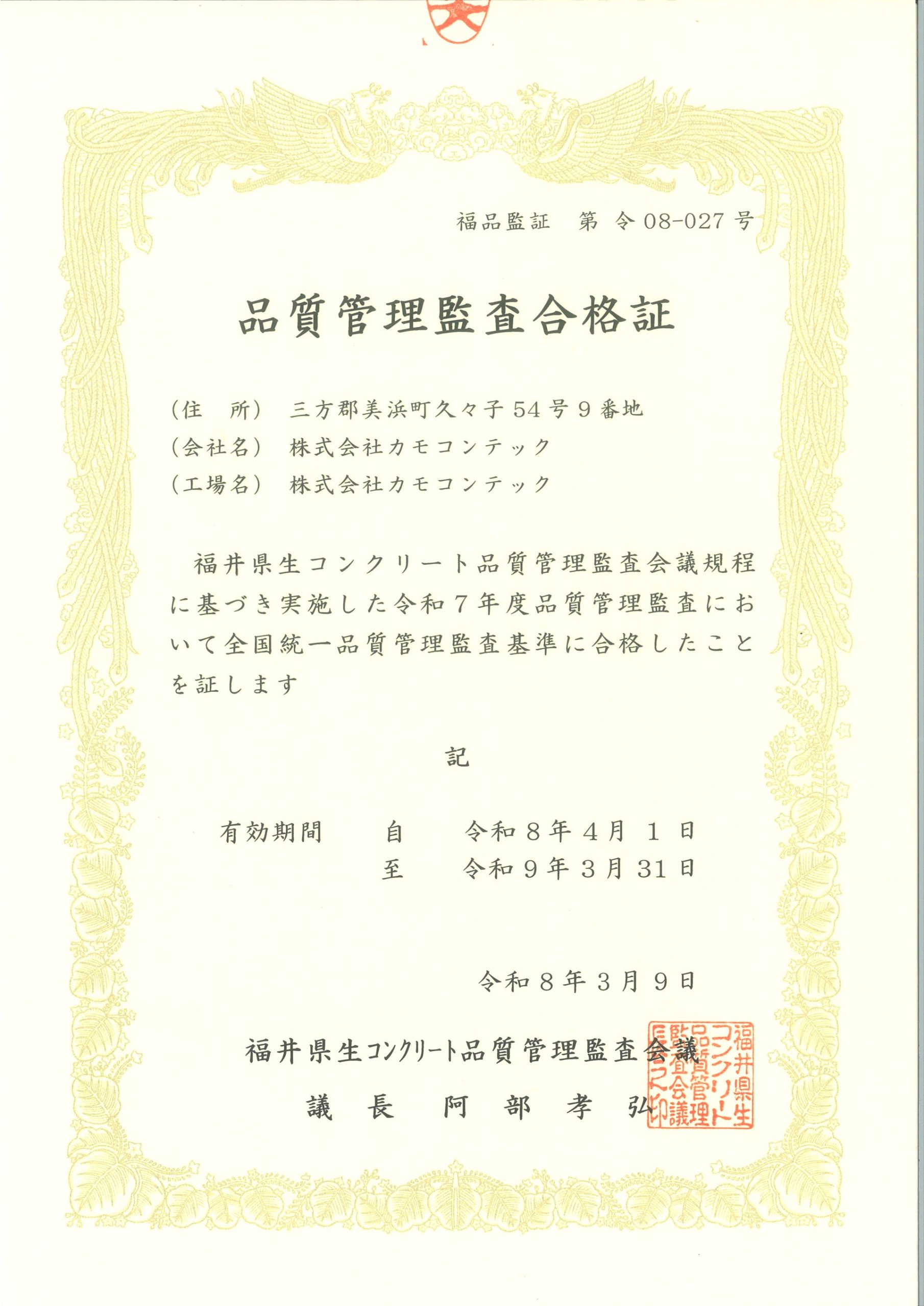 | 2022年9月 | 福井県嶺南地区生コンクリート協同組合加入 |